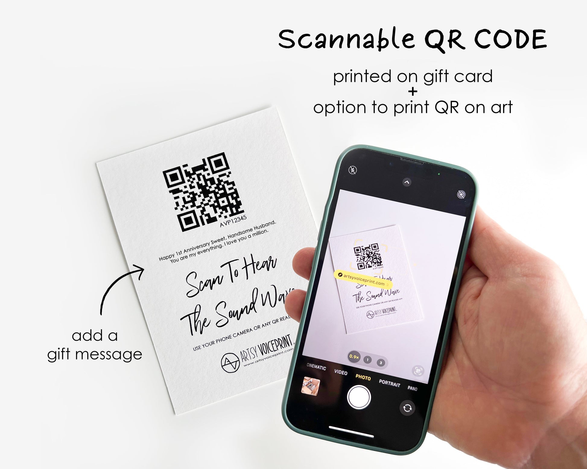 • A small card with the QR code printed on it is included with your order. We can print an optional gift message on the card. The QR code will play the recording for your order when scanned with your phone's camera.